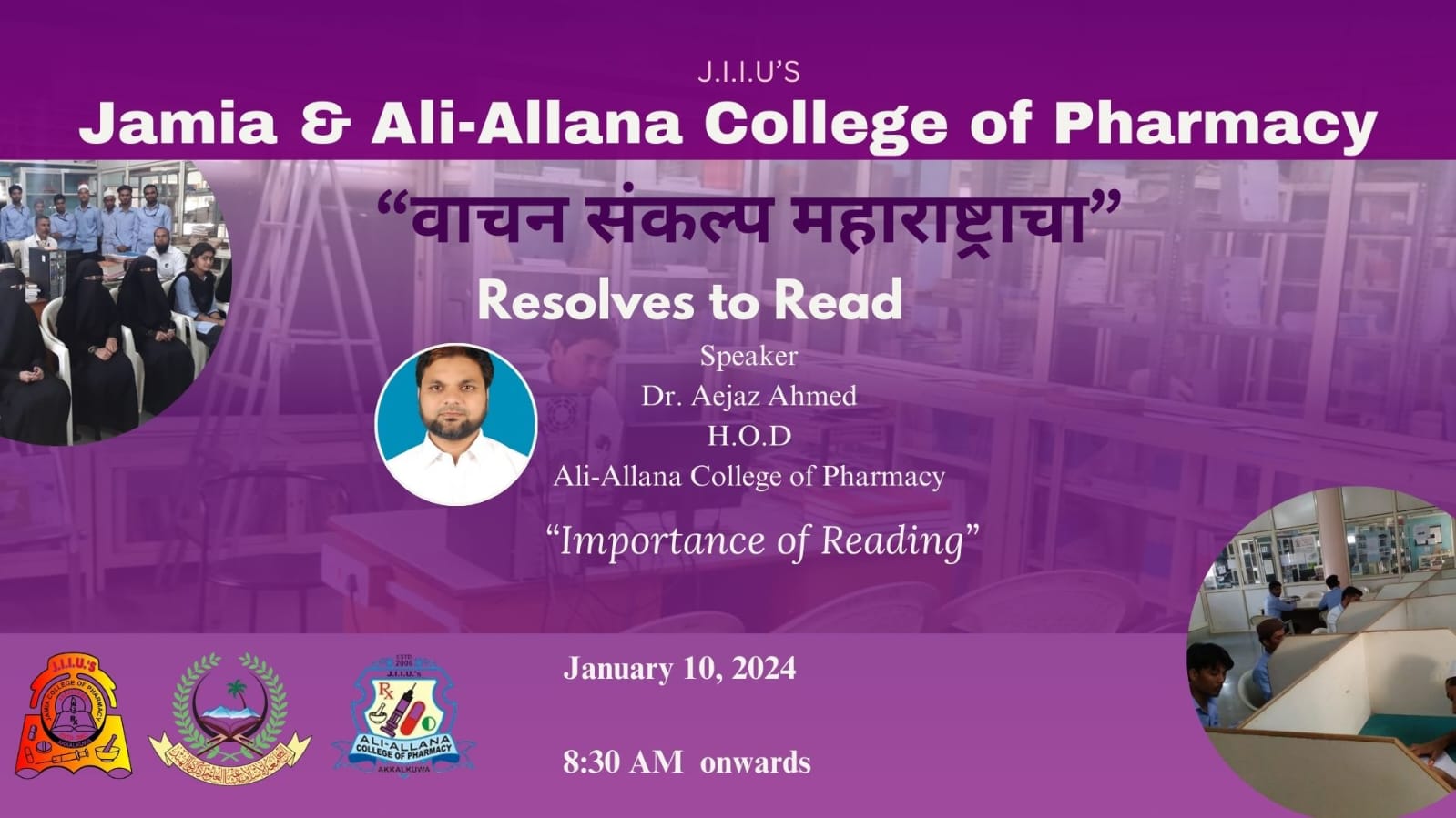 Jamia Pharmacy’s library offers books, journals, internet, and separate reading rooms, open 8 AM-11 PM.